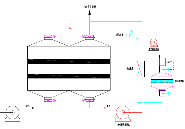 脫臭原理:反應塔內裝填特制的固態復合填料,填料內部復配多介質催化劑。當惡臭氣體在引風機的作用下穿過填料層,與通過特制噴嘴呈發散霧狀噴出的液相復配氧化劑在固相填料表面充分接觸,并在多介質催化劑的催化作用下,惡臭氣體中的污染因子被充分分解。適用范圍:適用范圍廣,尤其適用于處理大氣量、中高濃度的廢氣,對疏水性污染物質有很好的去除率。優點:占地小,投資低,運行成本低;管理方便,即開即用。缺點:耐沖擊負荷,不易污染物濃度及溫度變化影響,需消耗一定量的藥劑。