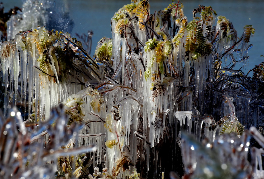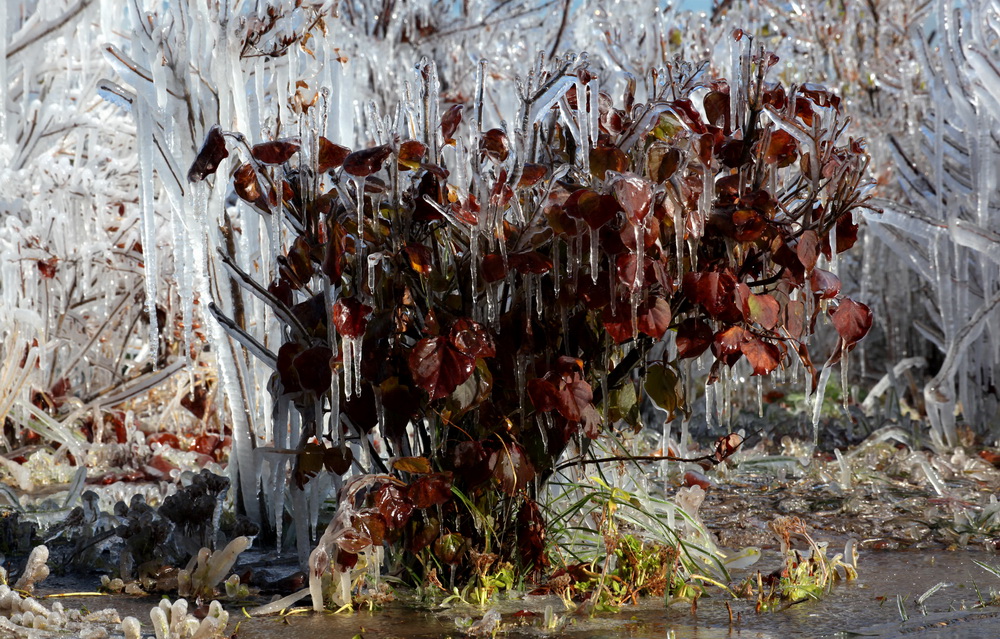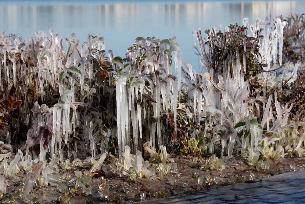 2015年10月31日,甘肅省張掖市,濱河新區(qū)受前一天強(qiáng)降雪天氣影響氣溫下降,正在灌溉的樹木、植被形成冰掛,玉樹瓊花美麗壯觀。