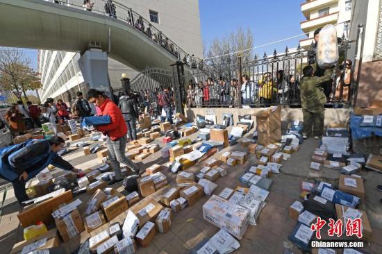 資料圖:11月14日,山西太原,山西財經(jīng)大學(xué)校園外擺滿各個物流公司發(fā)來的快遞。